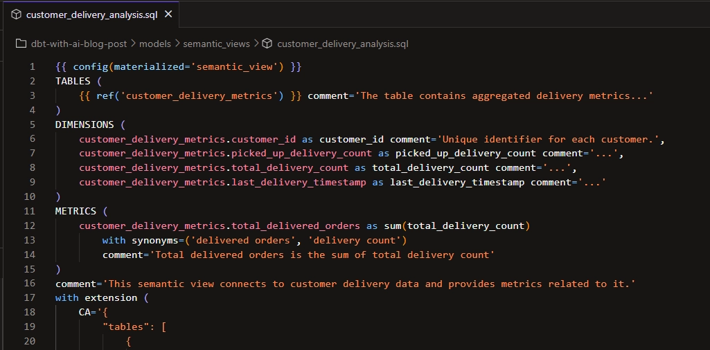Let’s grab the semantic view DDL by locating the view in Snowflake’s Catalog. Then, we’ll copy and paste this DDL definition in dbt. We need to do a couple of changes to really make it work, such as removing the create table statements, replacing the hardcoded refs and ideally improving the JSON appearance.